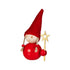 The red Elf girl Star-bearer is made from maple beads, and wearing a red cap and holding a star. Two braids are visible from under her cap. The braids have red beads at the ends. Elves are a great table setting centrepiece, window ornament, and a gift for friends of high-quality, Finnish craftsmanship.