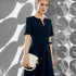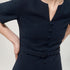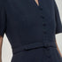 The figure-hugging Rianna dress features short sleeves, a round neckline with a slit, covered buttons at the front, a detachable belt, and a flared hem. The dress has a satin lining, and the surface of the outer material has a lively texture with a dim shine.